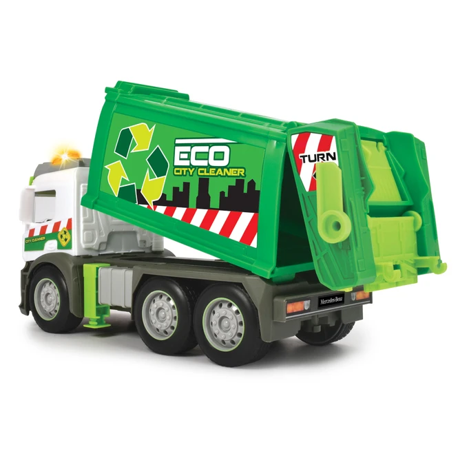 • Mercedes LKW – Das Spielzeug-Müllauto ist dem Original von Mercedes nachempfunden und besitzt eine offizielle Lizenz. Durch den Friktionsantrieb fährt der Truck nach schwungvollem Anschieben auch wenige Meter von selbst.
