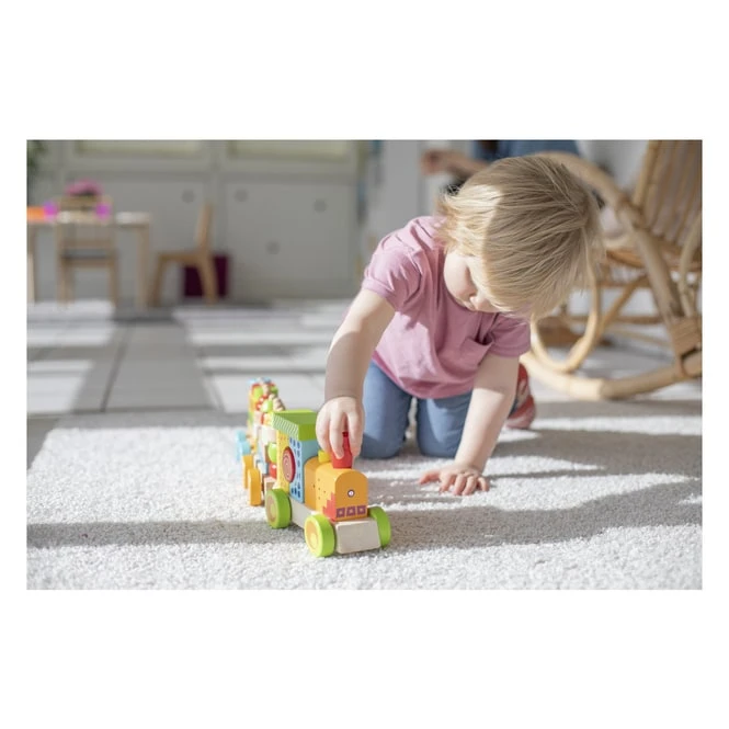 Hochwertiger, massiver und bunt bemalter Zug von Eichhorn Color für Kinder ab einem Jahr. Mit den beiden Wagons und den zahlreichen Steckbausteinen in verschiedenen Farben und Formen fördert und schult der Zug die Kreativität, die Feinmotorik und die Hand-Augen Koordination. Der Holz-Zug Color besteht aus insgesamt 31 Teilen, besitzt Licht- und Soundfunktion und hat eine Länge von 59 cm.