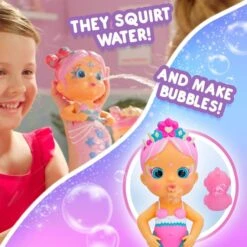 Auf den Bauch der Puppe drĂŒcken und schon spritzt Wasser aus dem Mund. AuĂerdem macht sie lustige Seifenblasen.