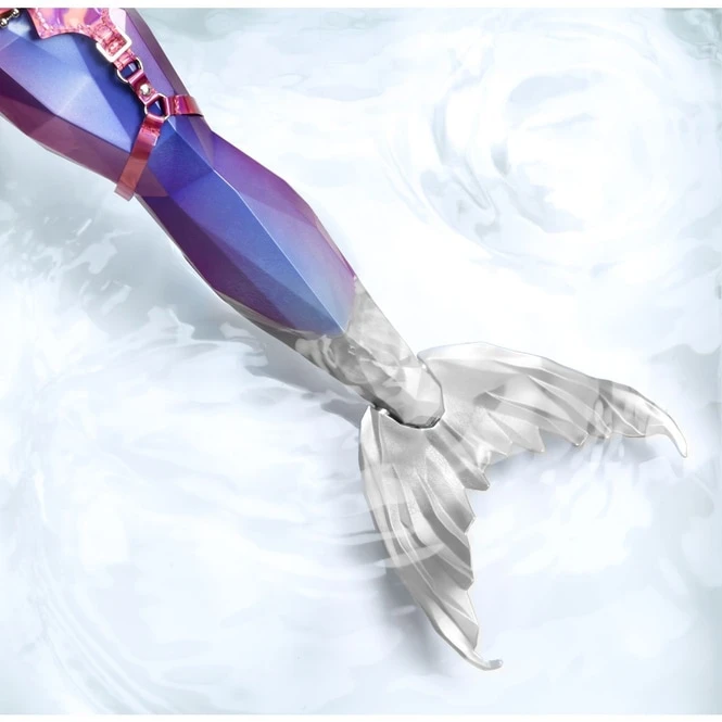 Jenseits der Wellen, unter der Brandung, im tiefen Blau… folge den fabelhaften Flossen der Mermaze Mermaidzâą, um etwas Erstaunliches zu entdecken! Harmonique hat wunderschönes, hochwertiges, hellrosa Haar, das zu einem Pferdeschwanz mit zwei lockigen fuchsiafarbenen Ranken frisiert ist. Sie hat wunderschöne Glasaugen und echte Wimpern sowie ein Fantasie-Make-up mit Metallic-Schatten und schwarzem und weiĂem Eyeliner. Harmonique trĂ€gt ein dramatisches Oberteil mit gepufften Schultern und ein Korsett mit Strasssteinen. Dazu trĂ€gt sie ein Headset, einen MetallgĂŒrtel, eine Tragetasche, eine Halskette und Ohrringe.