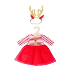 Vorhang auf für Rentier Rudi! Das Weihnachtspuppenkleid „Rentier Rudi“ von Heless mit Haarband sorgt für allerbeste Laune. Das fröhliche weiß-rot geringelte Oberteil mit Rentier-Print ist ein schöner Kontrast zum edlen roten Tüllrock, der mit Glitzerpünktchen tolle Akzente setzt. Ein roter Unterrock lässt das Kleid perfekt fallen. Abgerundet wird das Outfit durch das Rentier-Haarband mit prachtvollem, goldenen Geweih, das dank seines elastischen Bands auf jedes Puppenköpfchen passt. Nicht nur zur Weihnachtszeit, auch zu allen anderen festlichen Anlässen ist dieses hübsche Puppenoutfit ein absoluter Hingucker. Das Kleid passt den meisten marktgängigen Puppen der Größe 35-45 cm.